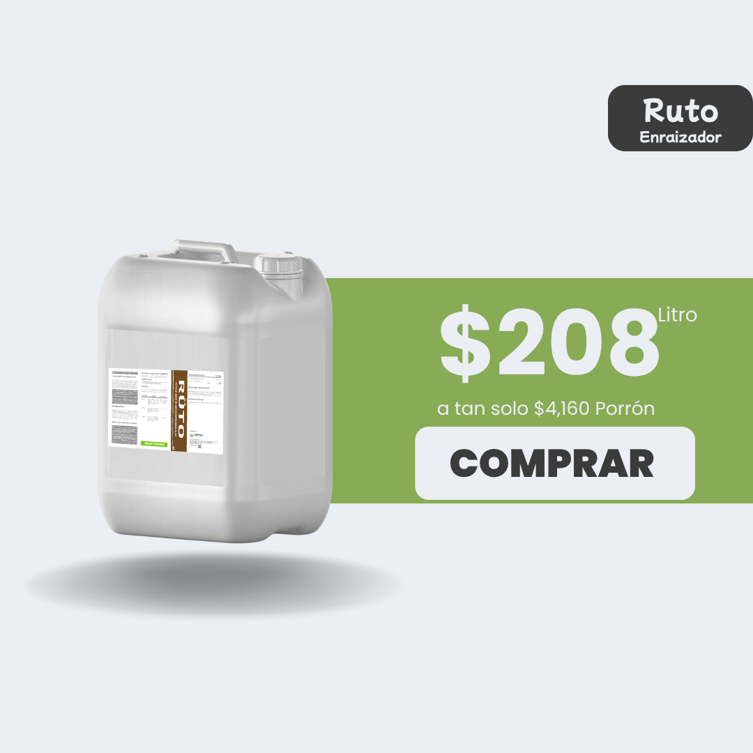 Rüto es un promotor de crecimiento radicular formulado con un complejo de auxinas activas que estimulan la división celular en tejidos meristemáticos, promoviendo el desarrollo de raíces primarias, secundarias y pelos absorbentes. Está diseñado para cultivos en etapas de trasplante, establecimiento y recuperación radicular, mejorando la absorción de agua y nutrientes desde el inicio del ciclo.